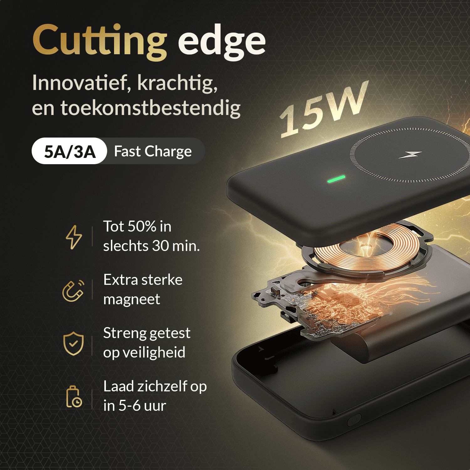 Tijd is kostbaar. Via de 22.5W USB-C Power Delivery-poort laad je bekabeld tot 70% in 30 minuten; de powerbank houdt de snelheid vast. Als powerbank biedt hij magnetische grip én tempo, en daarna is de powerbank in 5–6 uur weer volledig opgeladen.