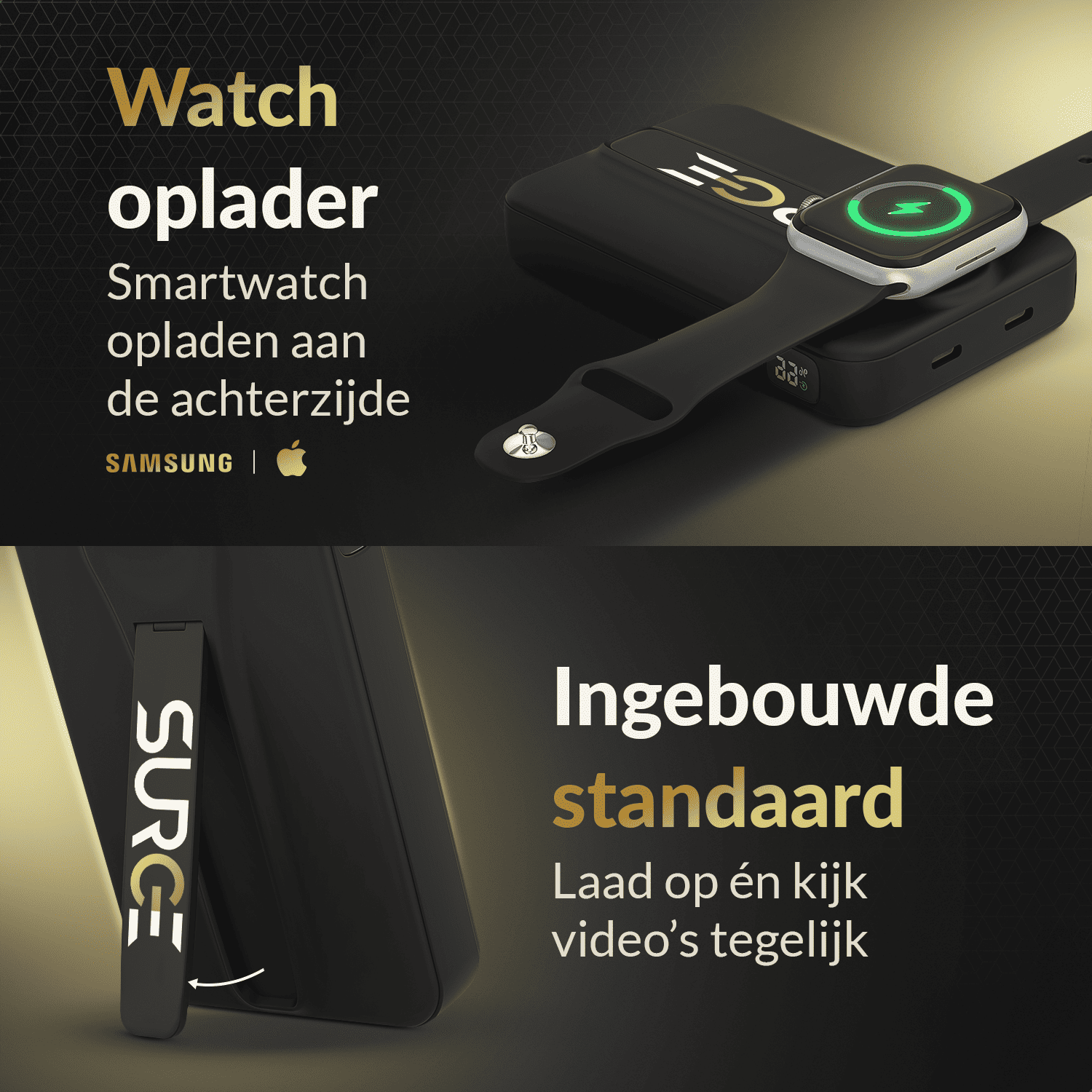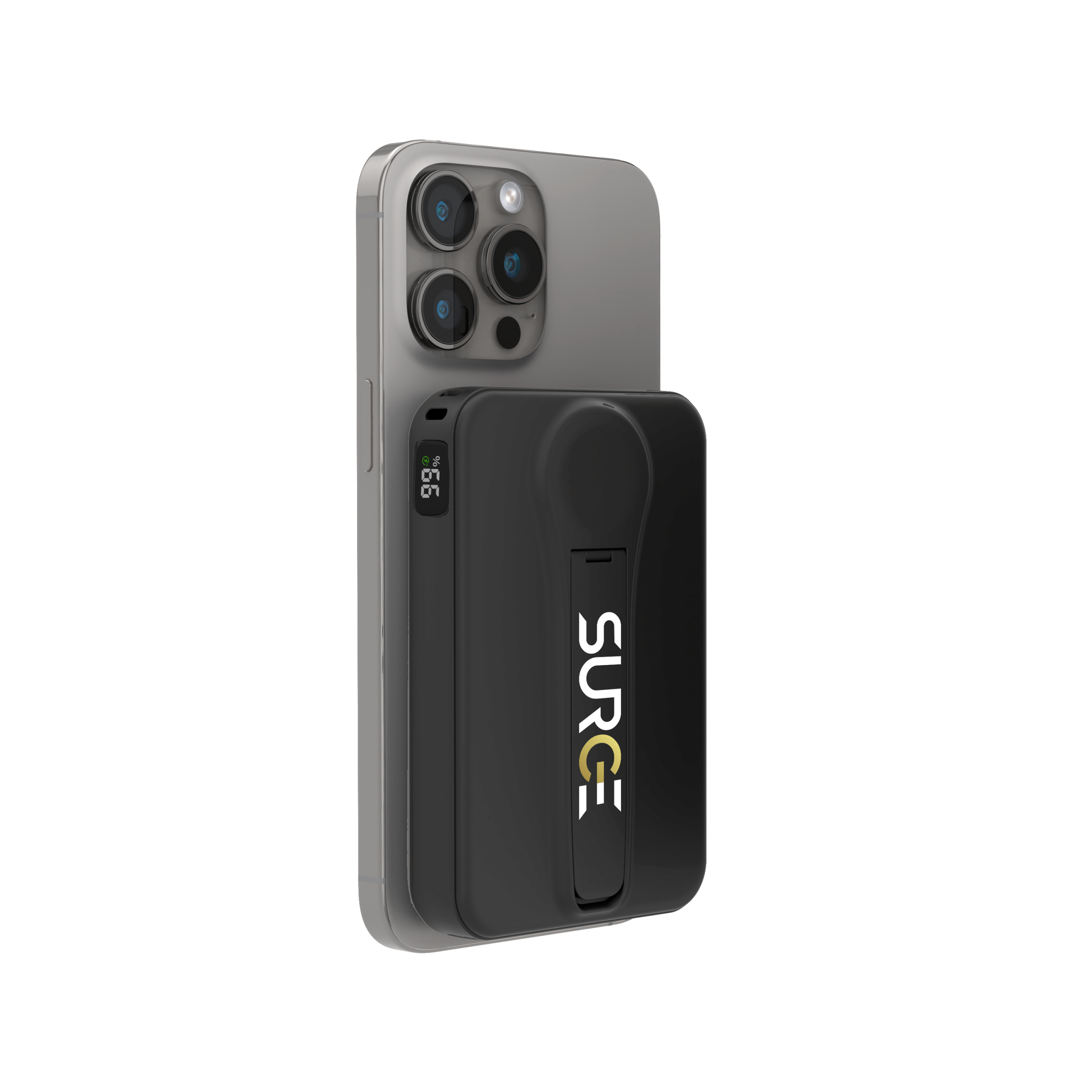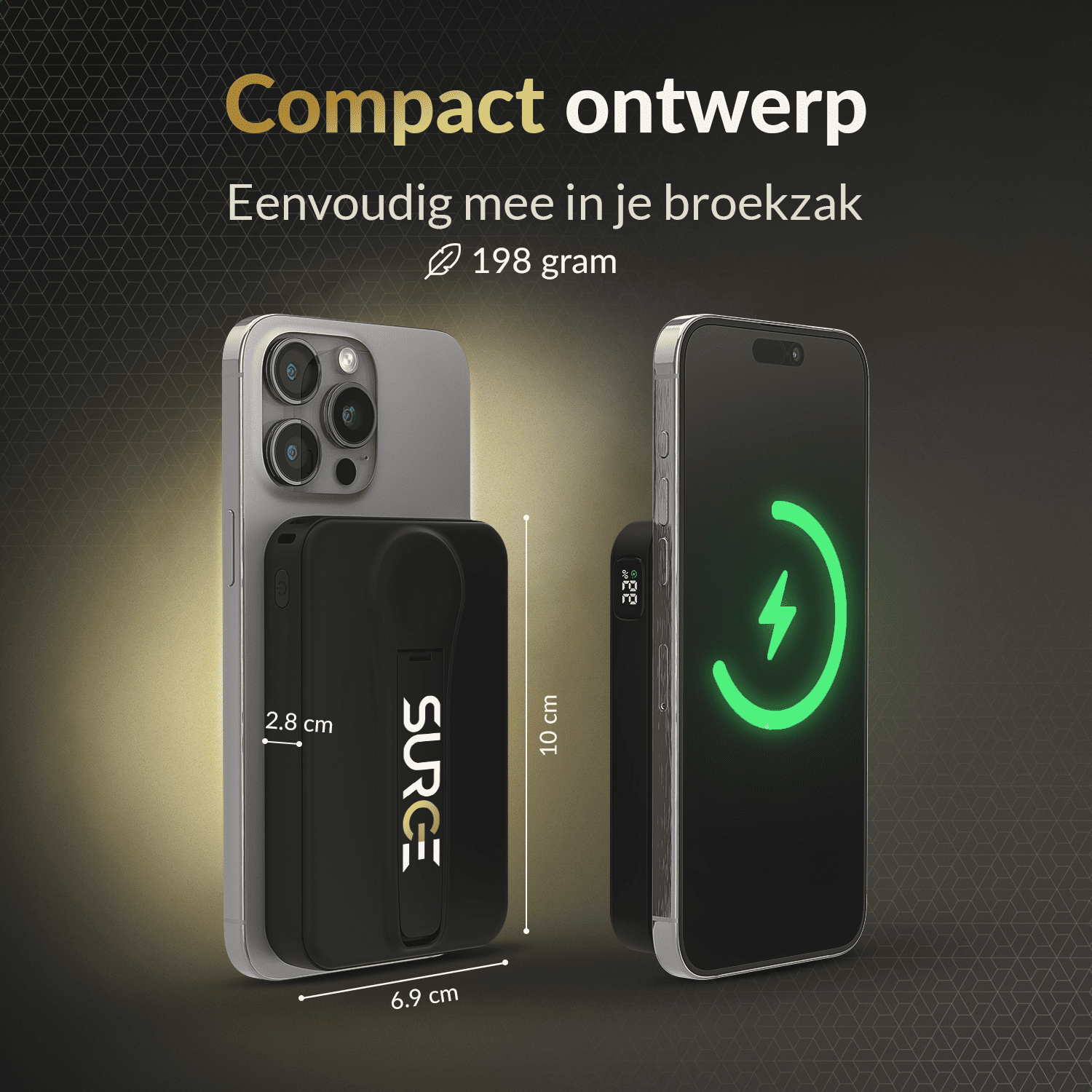 Maak kennis met de Surge draadloze powerbank: klein, licht en gemaakt voor zowel je telefoon als smartwatch. Onderweg? Klik ’m magneetvast op je apparaat en laad tot 70% in 30 minuten via USB-C of 15W draadloos—zonder gedoe met kabels. Deze powerbank zorgt voor snel en slim opladen, terwijl de powerbank veilig in je hand ligt.