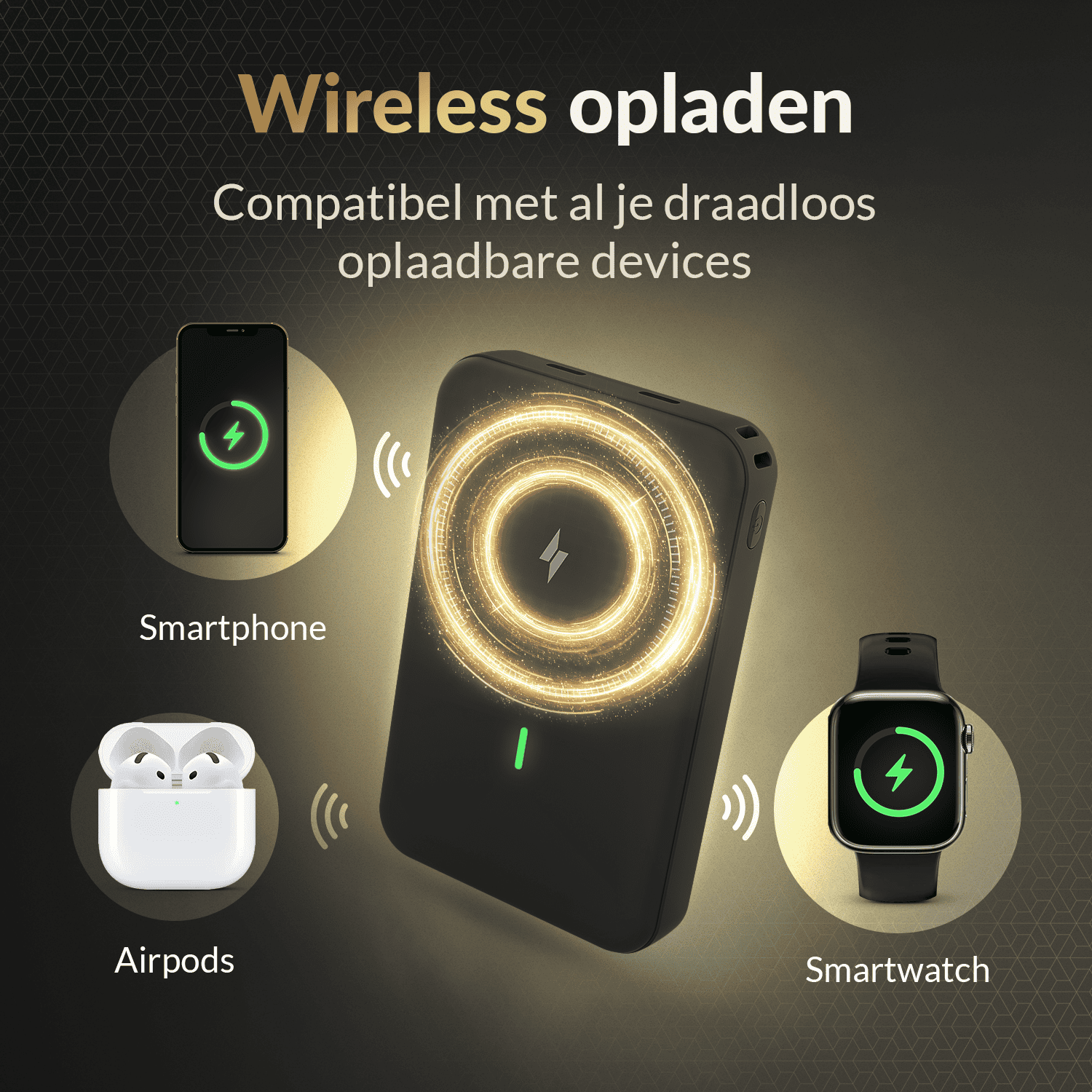Laad je smartwatch aan de achterzijde op, perfect aan je bureau, in de trein of tijdens het bingewatchen. Eén powerbank voor telefoon, oortjes én horloge: een alles-in-één oplossing die je setup vereenvoudigt. De powerbank ondersteunt gelijktijdig laden, zodat de powerbank zowel je telefoon als je watch voedt.