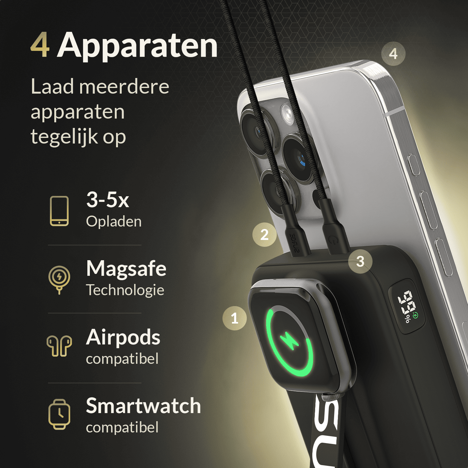 Laad 4 apparaten tegelijk op – 2× USB-C In/Output, draadloos geschikt voor MagSafe én een smartwatch-lader achterop; één powerbank voor al je devices.